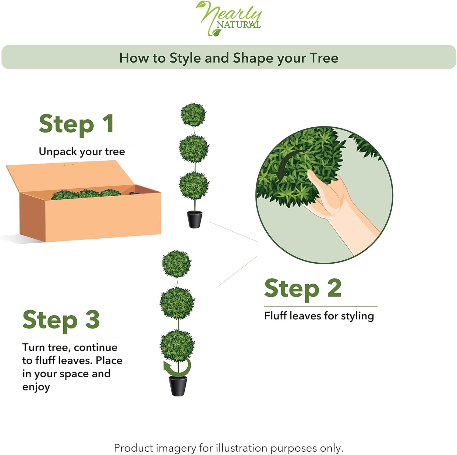 Elegantly greet guests with this triple boxwood topiary. Three perfectly trimmed boxwood balls sit in synergy and are made of realistic-looking boxwood foliage. You can now enjoy the sophistication of the boxwood without maintenance or care. Standing 3' from a black nursery planter (included in height), curate in compact spaces. Perfect for an apartment, bathroom, room corner, or foyer.Silk trees are manufactured using synthetic materials, such as polyester material or plastic, and are well designed and constructed to be life-like in appearance. This item will need to be re-shaped when removed from the secure box to allow it to reach its fullest size. Your artificial plant will look beautiful for years to come; simply wipe clean with a soft dry cloth when needed. About Nearly Natural Inc. - For over 75 years, Nearly Natural Inc. has been providing conscientious consumers with beautiful alternatives to natural decorations. Employing and advised by naturalists who understand the live plant world, Nearly Natural is able to recreate the most realistic-looking decorative items for homes, offices, and businesses. Driven by a true commitment to customer service, attention to detail, and natural philosophy, Nearly Natural strives to bring customers the most beautiful, unique, and striking faux plants and floral on the market. Construction materials: Iron Wire, Plastic